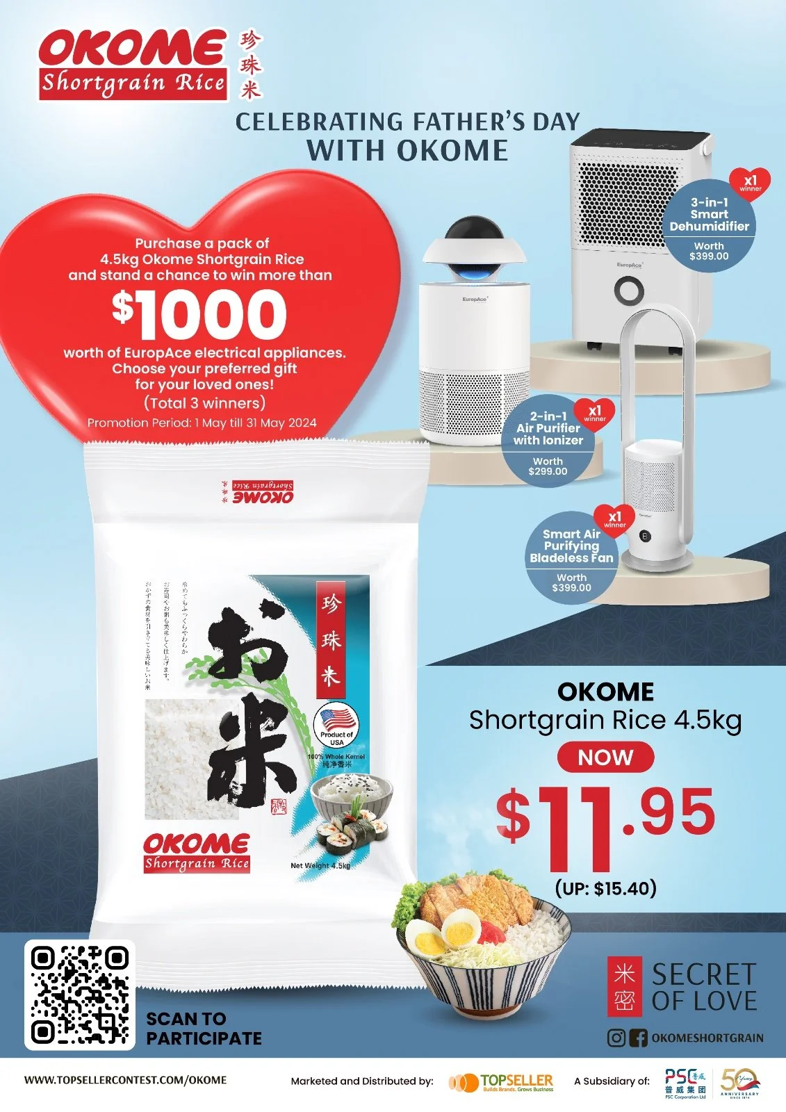 Purchase a pack of 4.5kg Okome Shortgrain Rice and stand a chance to win more than $1000 worth of EuropAce kitchen appliances. Choose your preferred gift for your loved ones!